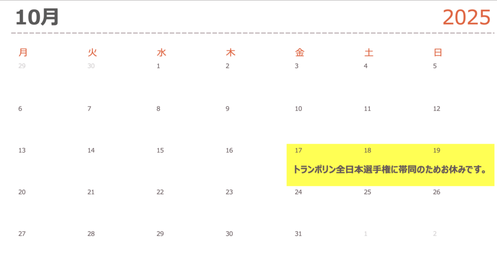 今回のお休みは、トランポリンの全日本選手権大会に出場する